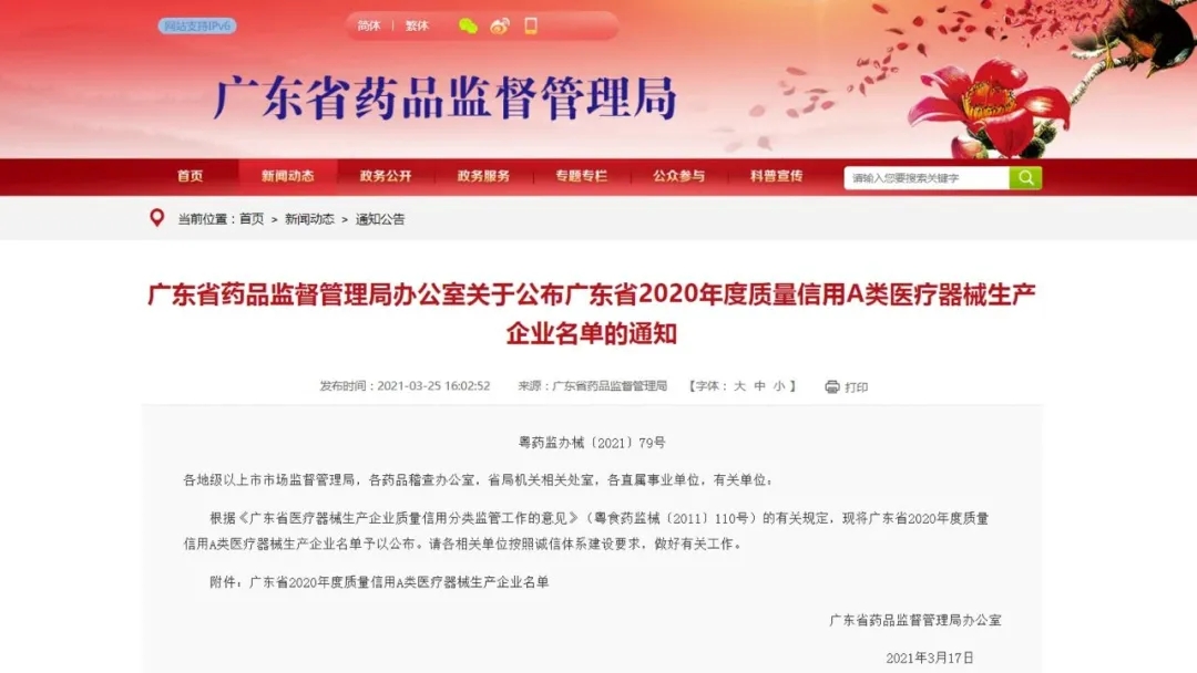 根據(jù)《廣東省醫(yī)療器械生產(chǎn)企業(yè)質(zhì)量信用分類監(jiān)管工作的意見(jiàn)》(粵食藥監(jiān)械〔2011〕110號(hào))的有關(guān)規(guī)定,廣州市倍爾康醫(yī)療器械有限公司有幸被評(píng)為“廣東省2020年度質(zhì)量信用A類醫(yī)療器械生產(chǎn)企業(yè)”。
