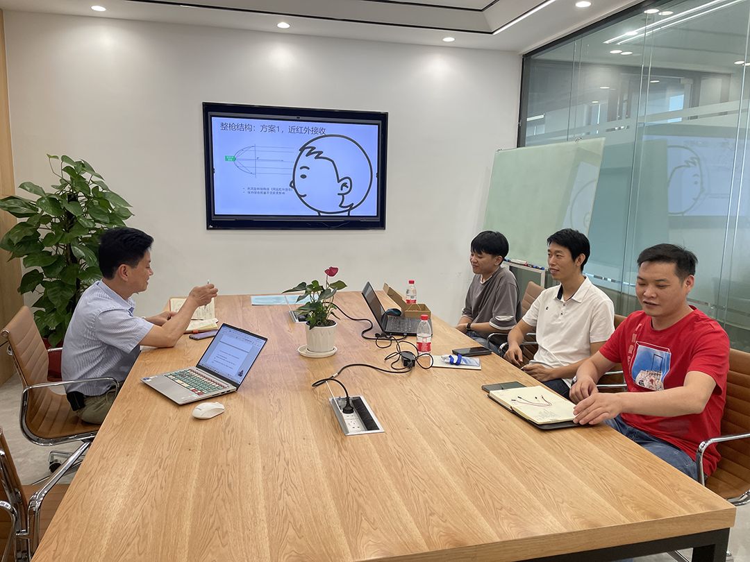 周斌(右二)和倍爾康公司工程師討論下一代紅外測溫槍方案